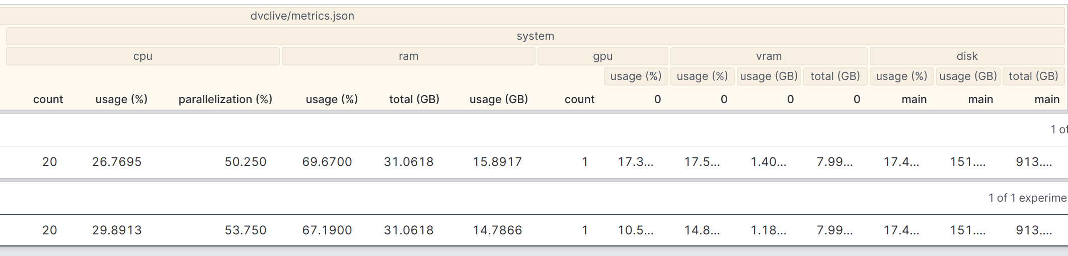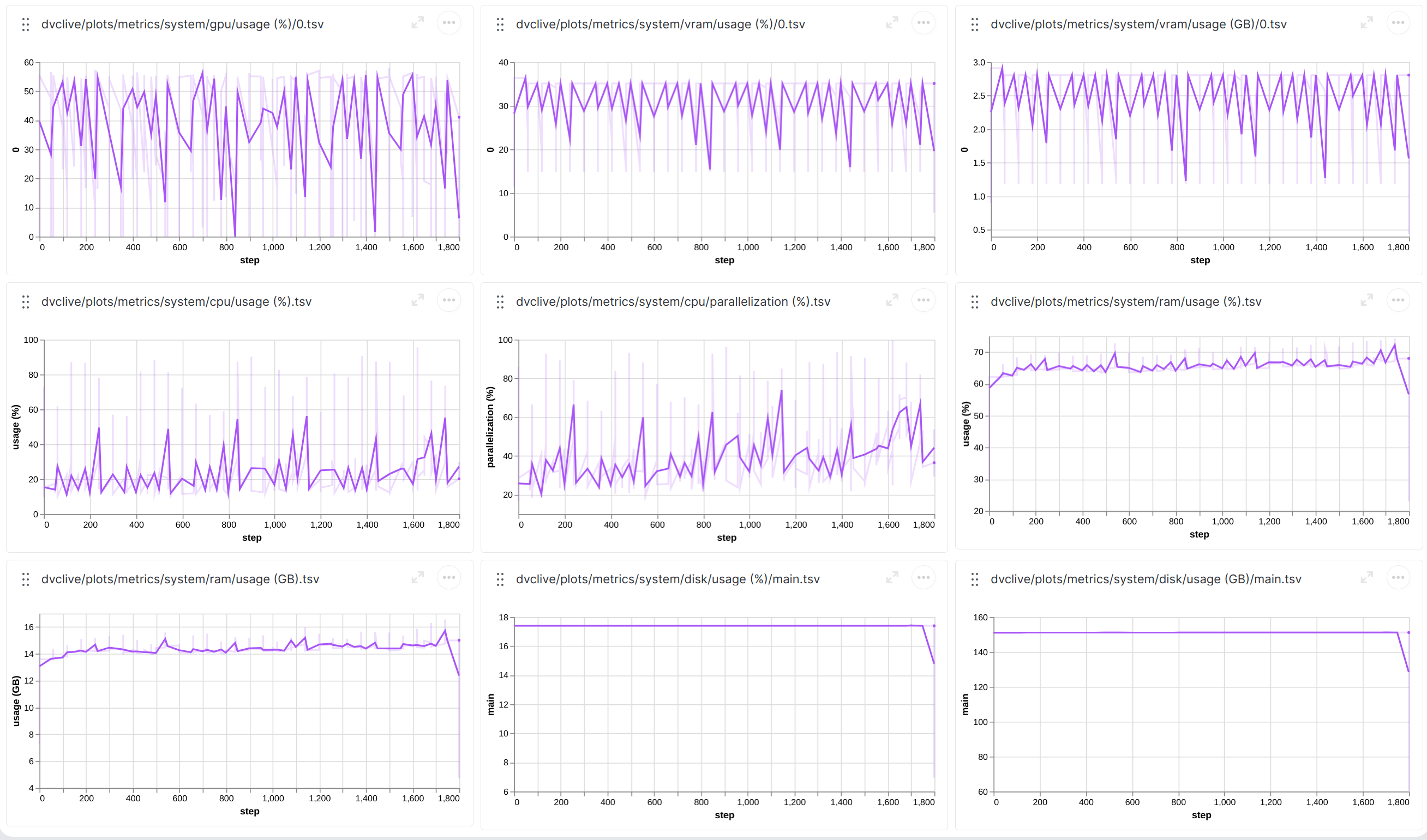 DVCLive can track and log your system metrics so you can see your hardware performance and limitations during your experiments. The metrics concern your CPU, RAM and disk memory usage. It can also monitor your GPU usage, if you have some.