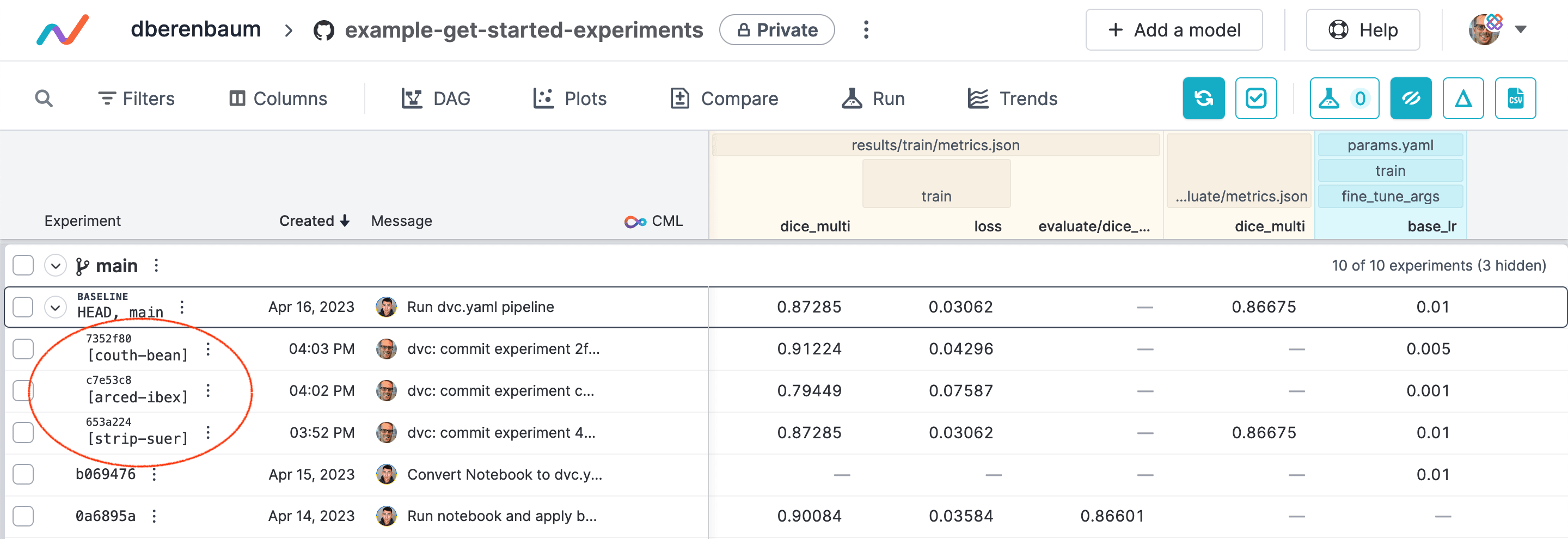 - push experiment code and metadata to your Git repo